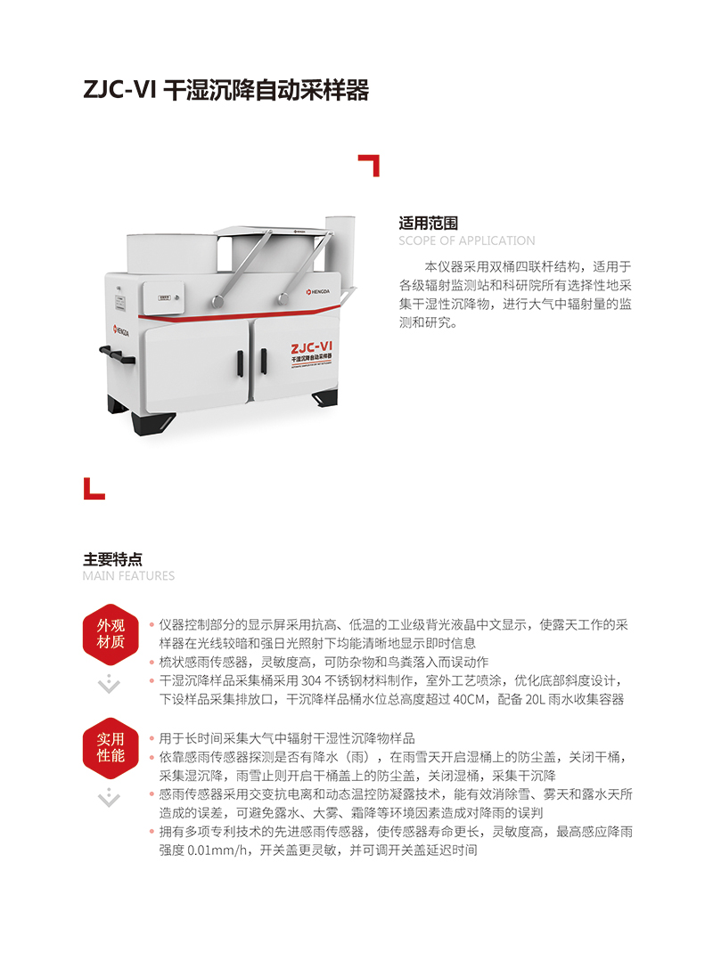 本儀器采用雙桶四聯桿結構,適用于各級輻射監測站和科研院所有選擇性地采集干濕性沉降物,進行大氣中輻射量的監測和研究